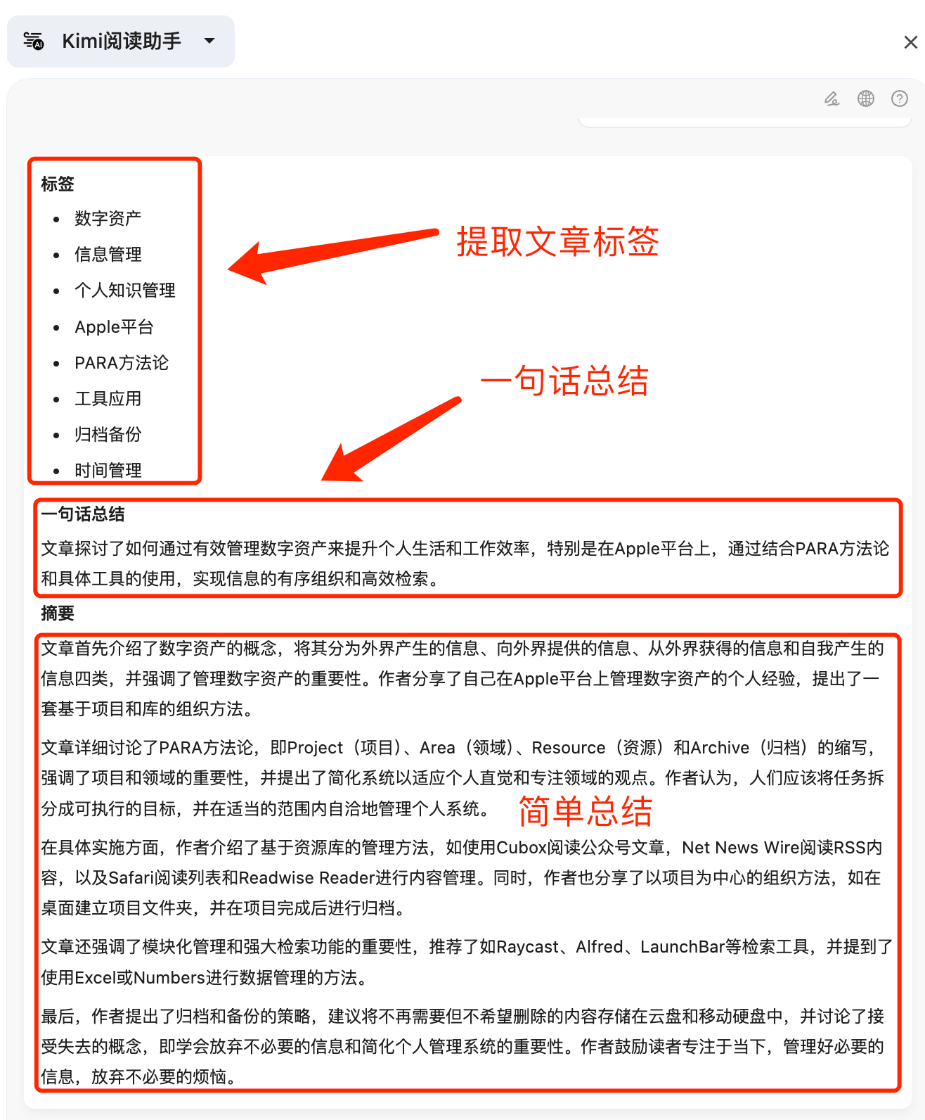 所以现在当我打开一篇文章准备阅读之前,先让kimi帮我总结一下这篇文章的核心内容,我在根据实际情况来决定是否当下立马阅读还是先放进收藏夹。